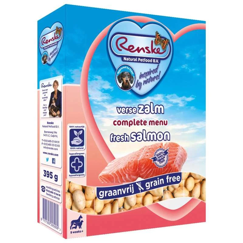 | Samenstelling | Vers gestoomde zalm (80%), aardappel (10%), gedroogd zeewier (0,84%), cichoreiwortel extract (als bron van prebiotica fructo-oligosacchariden), yucca extract. |